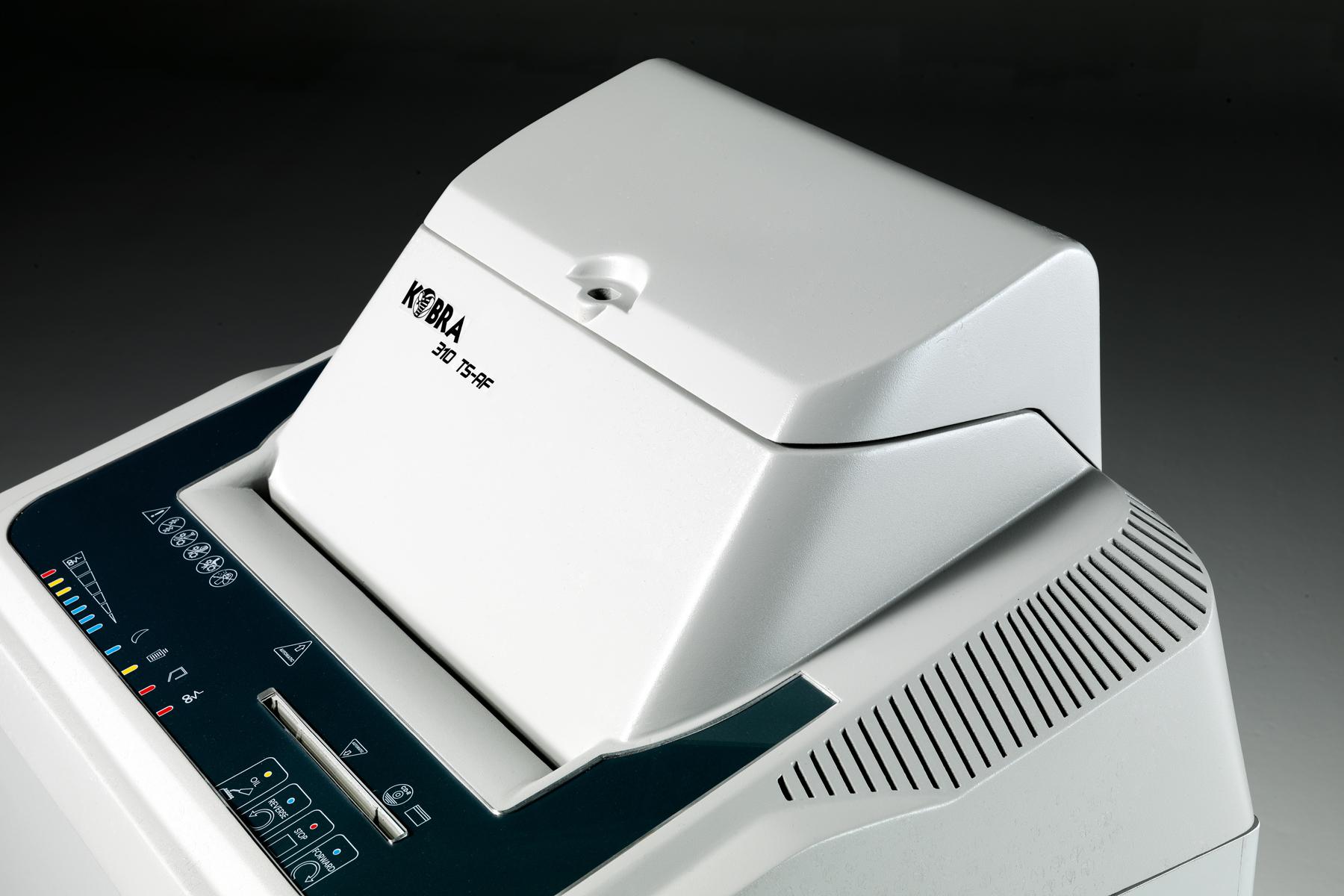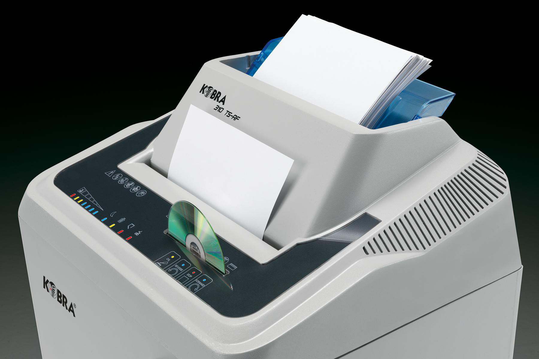 Professional touch screen shredder: all controls are activated by simply touching the panel. Motor thermal protection: two 24 hour continuous duty motors without overheating and duty cycle. Kobra 310 TS AF CC4 can shred up to 31 sheets at a time (manual feeding) in 3,9 x 40 mm cross cut (P-4). The automatic feeder shreds up to 170 sheets whilst the operator can shred – at the same time – paper and CDs/DVDs/credit cards through the dedicated cutting units. Heavy duty chain drive with steel gears and carbon hardened steel cutting knives which offer reliability and resistance to wear.