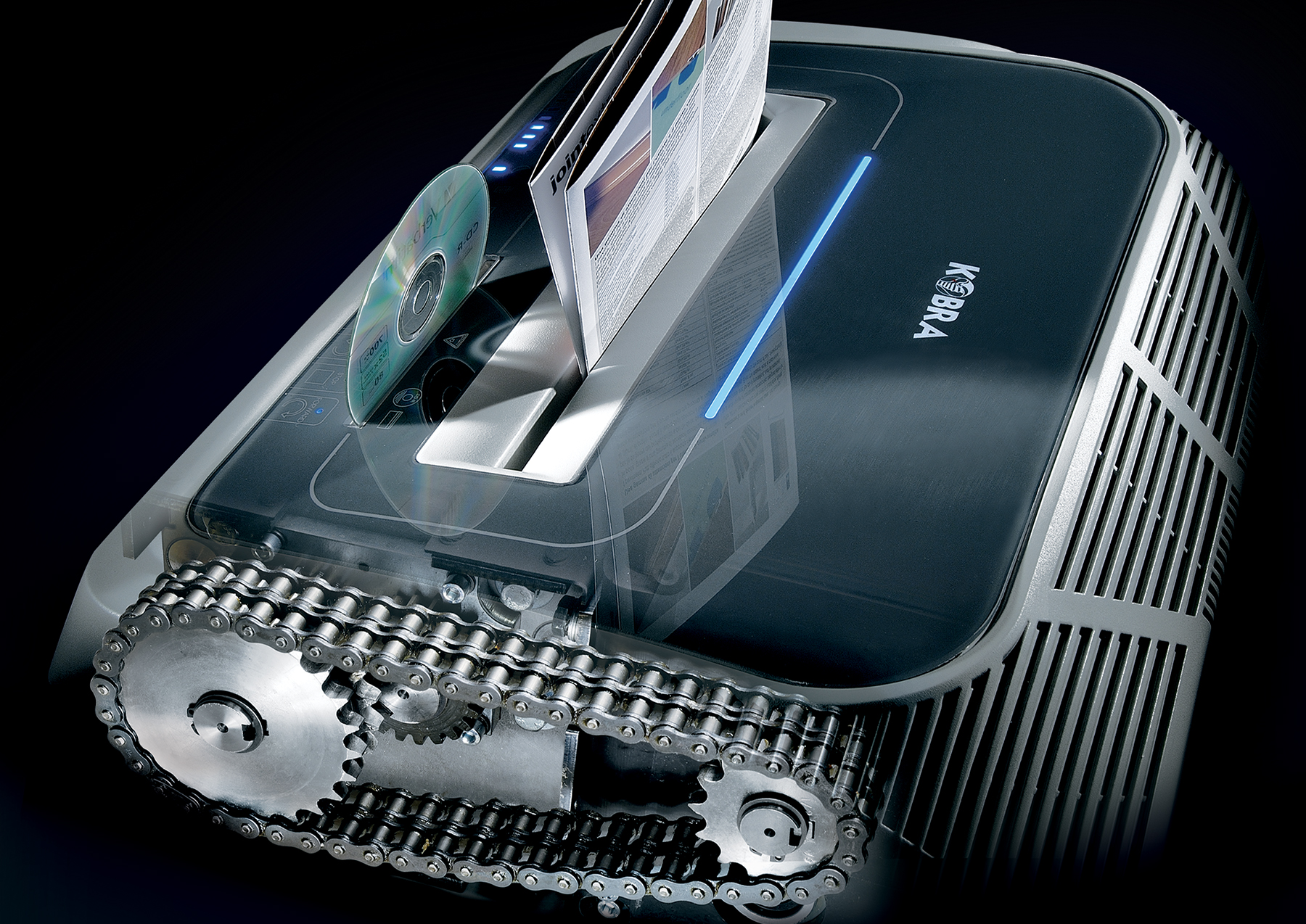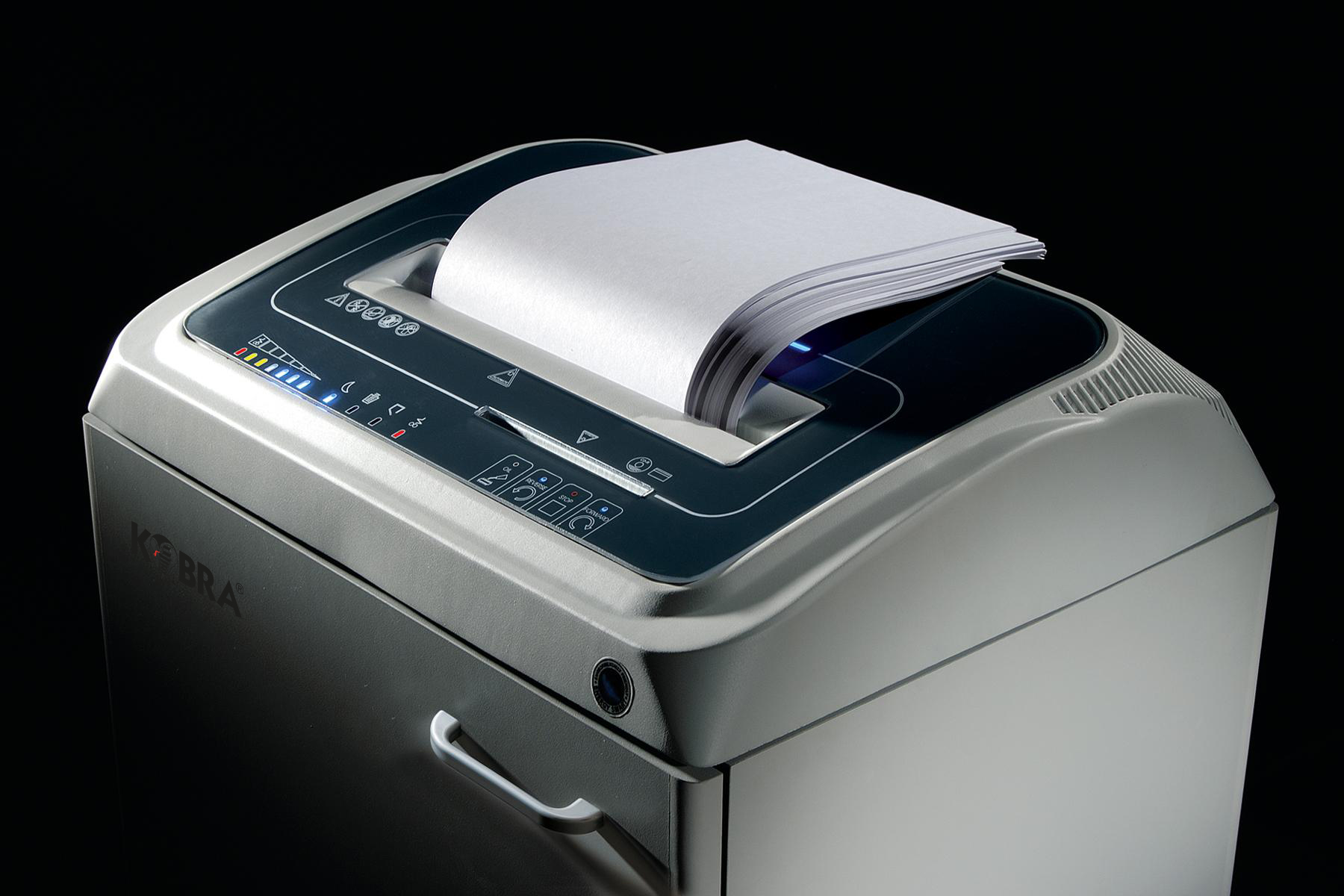 Professional touch screen shredder: all controls are activated by simply touching the panel. Motor thermal protection: two 24 hour continuous duty motors without overheating and duty cycle. Kobra 310 TS SS5 can shred up to 47 sheets a a time in 5,8 mm mm straight cut (P-2). Carbon hardened steel cutting knives, unaffected by staples and metal clips, high precision design of cutting knives allows high shred loads with low power consumption. Heavy duty chain drive with steel gears which offer reliability and resistance to wear.